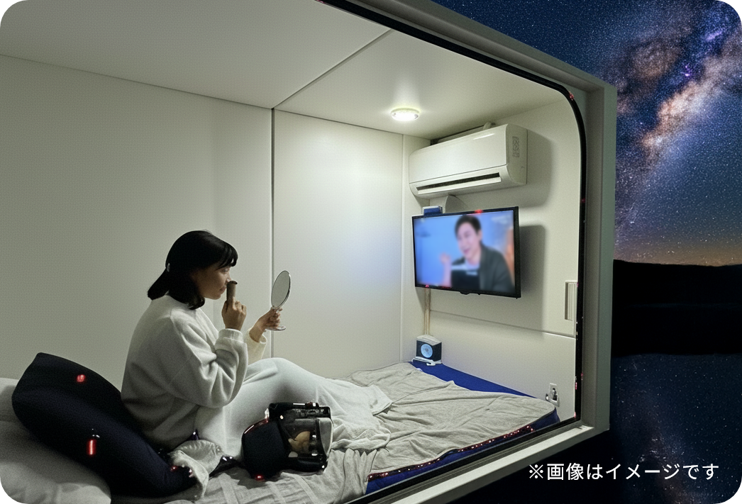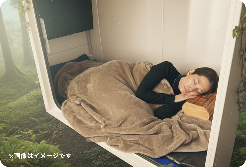 静かなBOX内で横になり、マットレスとまくらで快適な休息を。