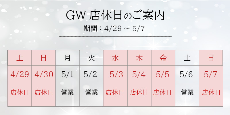 O2Clipsでは、下記の期間をGW休業日といたします。