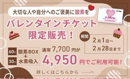 大切な人や、自分へのご褒美を! バレンタイン期間の限定チケット販売中! 限定チケット購入で酸素BOX60分+水素吸入30分の利用が、通常7,700円→4,950円でご利用可能! こちらのチケットサイトからも購入可能です♪ https://support111.stores.jp/items/67a2d2f3a4c97202299799b6【キャンペーン内容】
